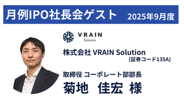 株式会社 VRAIN Solution 菊地 佳宏様早稲田大学商学部を卒業後、みずほ銀行にて営業として融資やM&Aなどのソリューション業務に従事。2021年に創業1年未満の株式会社VRAIN Solutionへ入社し、管理部門を担当。2022年5月より取締役コーポレート部部長に就任し、当社創業からわずか4年弱でのIPO実現を主導。経理・財務、採用、IRなど幅広い分野を管掌しながら、同社の成長を支えている。2024年2月東証グロース市場にIPO(新規上場)